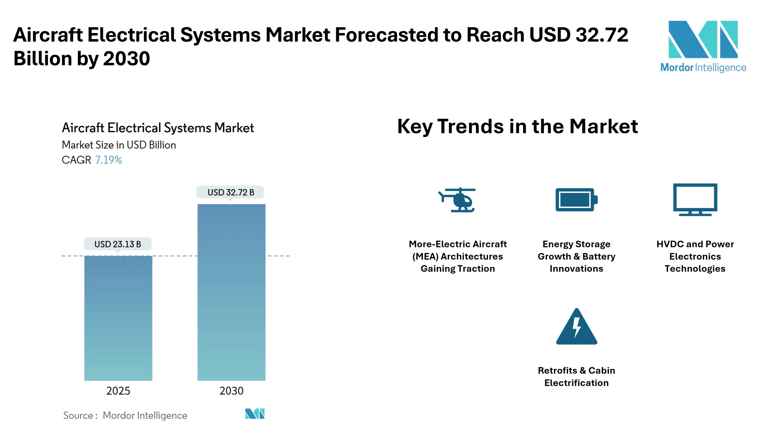 The Aircraft Electrical Systems Market is projected to grow from approximately USD 23.13 billion in 2025 to around USD 32.72 billion by 2030, according to Mordor Intelligence. This reflects a compound annual growth rate (CAGR) of about 7.19% over the forecast period. The rising demand is driven by commercial aviation recovery, military modernization, increasing interest in aircraft electrification, and the shift toward more-electric architectures. The market’s expansion is expected to be strongest in Asia-Pacific, while North America remains the largest market by value.