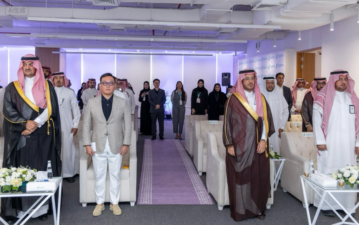 Photo Capition: First row, from left: His Royal Highness Prince Khalid bin Saud Al-Faisal; Mr. Steven Chou, Chairman of Sahm Capital; and Dr. Saad   Al-Harbi Deputy Minister of Education for Student Capabilities Development, during the Saudi National Anthem.