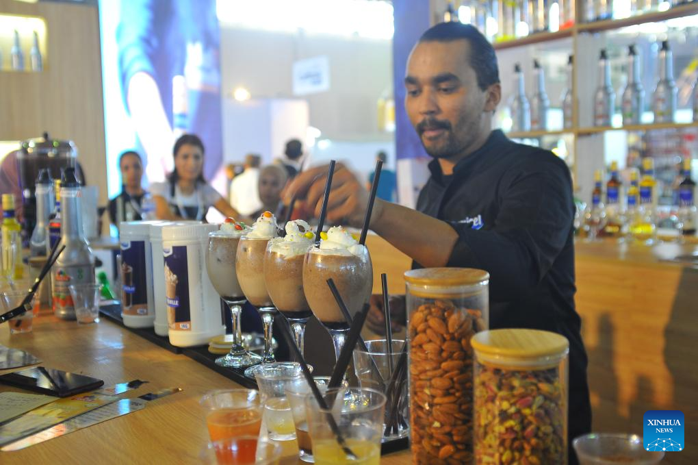 A man prepares a coffee drink at the international coffee exhibition “Spring of Coffee” in Tunis, Tunisia, on Oct. 5, 2023. (Photo by Adel Ezzine/Xinhua)