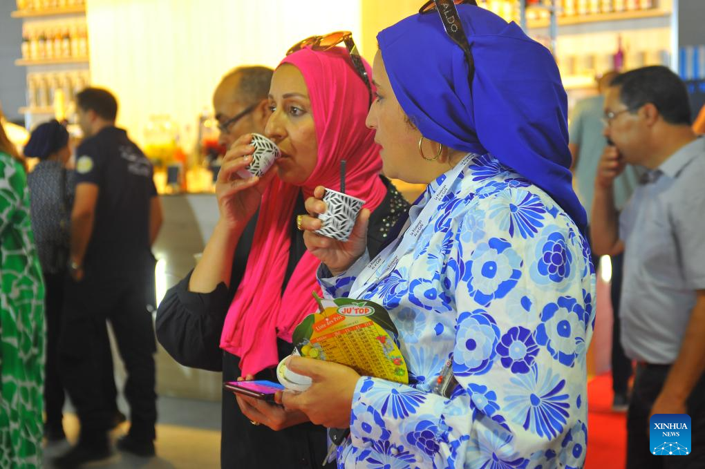 A woman tastes coffee at the international coffee exhibition “Spring of Coffee” in Tunis, Tunisia, on Oct. 5, 2023. (Photo by Adel Ezzine/Xinhua)