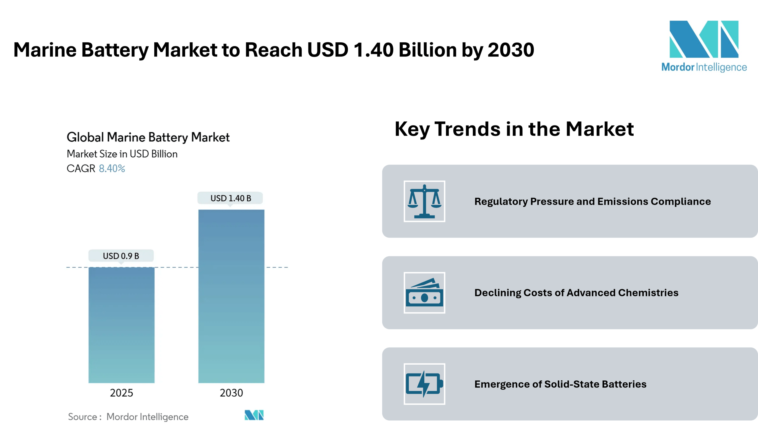 The marine battery market is forecast to expand significantly, with its market size projected to grow from USD 0.9 billion in 2025 to approximately USD 1.40 billion by 2030, according to a recent intelligence report by Mordor Intelligence. This represents a compound annual growth rate (CAGR) of around 8.40 percent during the forecast period. Key trends fueling this growth include stricter emissions regulations, innovations in battery chemistry, and growing investments in electric and hybrid marine propulsion systems.