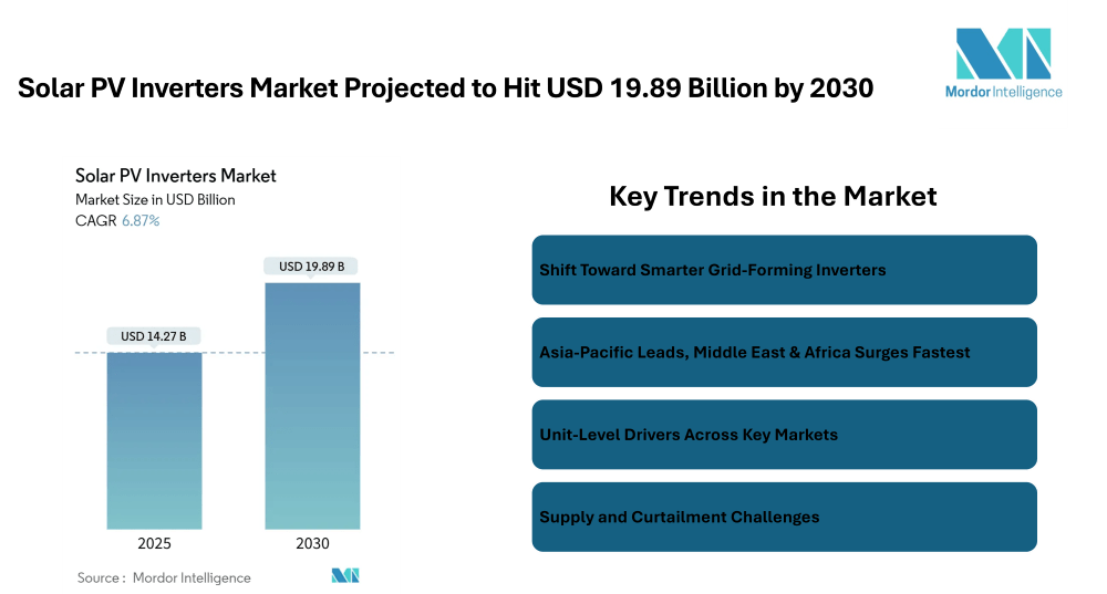 Solar PV Inverters Market is set to grow from USD 14.27 billion in 2025 to USD 19.89 billion by 2030, registering a compound annual growth rate (CAGR) of 6.87%.