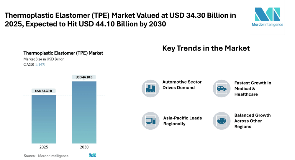 The Thermoplastic Elastomer (TPE) Market is valued at USD 34.30 billion in 2025, and is expected to grow to USD 44.10 billion by 2030, registering a compound annual growth rate (CAGR) of approximately 5.14% over the forecast period. This forecast highlights a solid growth trajectory driven by demand across automotive, medical, construction, and consumer goods industries. As manufacturers prioritize materials that offer flexibility, recyclability, and lightweight performance especially in electric vehicles and medical disposablesTPEs stand out as a preferred choice. Asia-Pacific leads the way as both the largest and fastest-growing regional market.